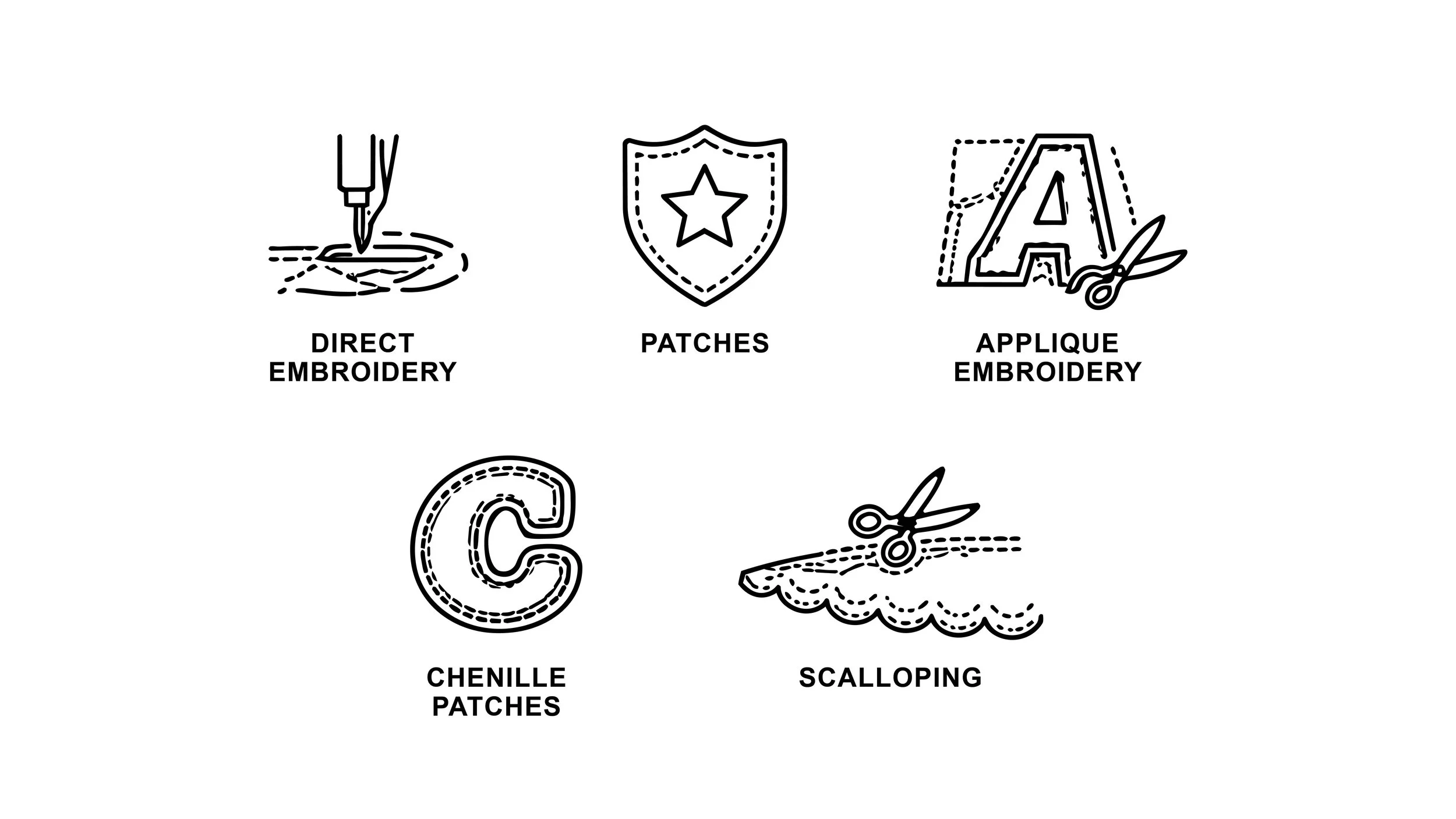Our embroidery services combine craftsmanship with advanced production techniques to deliver high-quality, durable results. From Direct Embroidery and Applique Embroidery to Patches, Chenille Patches, and Scalloping, we offer a wide range of options to bring designs to life with precision and texture. By utilizing modern embroidery technology and skilled workmanship, we ensure every detail—from stitching density to color clarity—is carefully executed. This allows us to produce consistent, long-lasting embellishments that elevate the look and feel of each product, providing our customers with reliable quality and refined finishing in every piece.